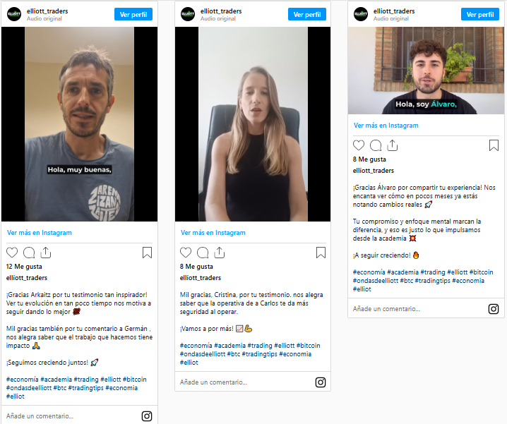 ✅ Casos de éxito reales de alumnos, publicados en su canal y en Instagram